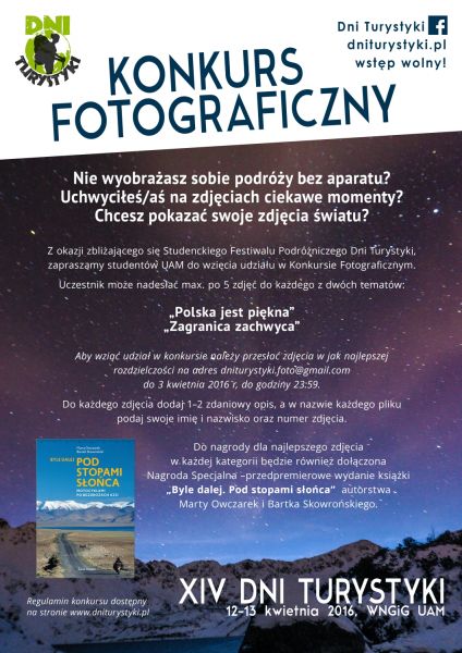 Szanowni Państwo Pracownicy, Doktoranci i Studenci! W dniach 12-13 kwietnia 2016 na Wydziale Nauk Geograficznych i Geologicznych w Collegium Geographicum odbędą się Dni Turystyki. XIV Dni Turystyki - festiwal podróżniczy organizowany przez studentów Turystyki i Rekrecji. Ma na celu przybliżenie kultury oraz geografii najróżniejszych zakątków świata. Dzięki tej imprezie można poznać smak świata i poczuć się jak w drodze. Więcej informacji na stronie internetowej dniturystyki.pl i oficjalnym fanpage Dni Turystyki.