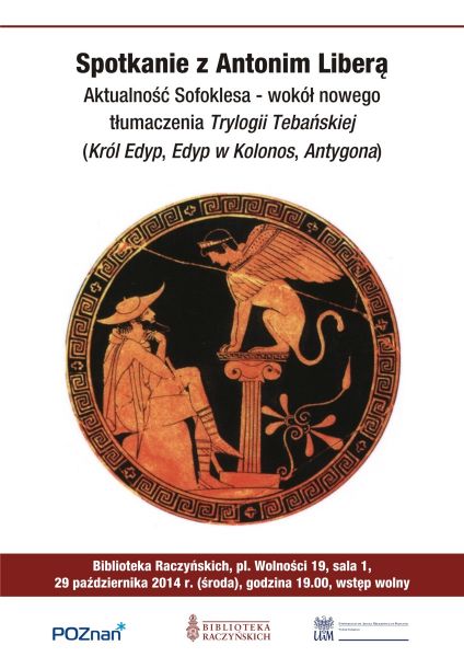 Wydział Teologiczny Uniwersytetu im. Adama Mickiewicza w Poznaniu oraz Biblioteka Raczyńskich zapraszają na spotkanie z Antonim Liberą - Aktualność Sofoklesa – wokół nowego tłumaczenia Trylogii Tebańskiej.