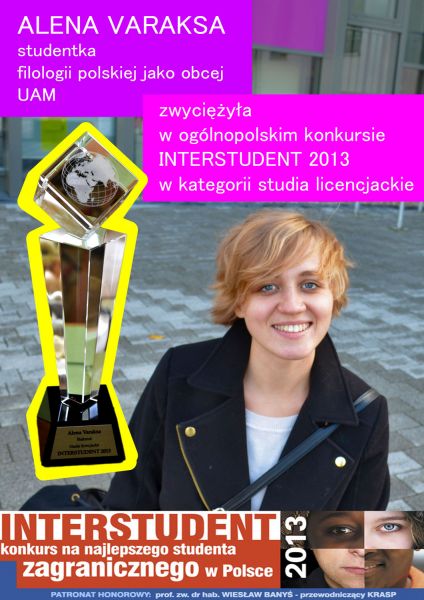 Alena Varaksa znana jest już w środowisku UAM jako laureatka konkursu fotograficznego „UAM moją uczelnią” i konkursu na film promujący uczelnię („Ptasie radio” – nagroda publiczności). Na macierzystym kierunku i w Collegium Polonicum działa bardzo aktywnie, angażując się w przedsięwzięcia artystyczne (szereg filmów animowanych dostępnych na Youtube na kanale filologii polskiej jako obcej, wystawy fotograficzne), jak i naukowe (organizacja studenckiej międzynarodowej konferencji translatologicznej, współorganizacja wydarzeń o charakterze naukowym i popularnonaukowym, także międzykulturowym).