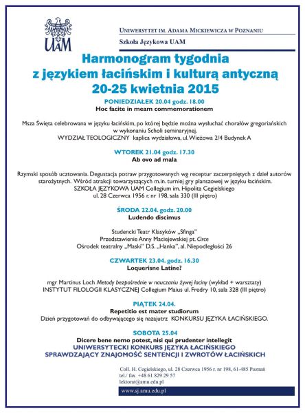 Wykładowcy zespołu języka łacińskiego Szkoły Językowej UAM przy współpracy Instytutu Filologii Klasycznej zapraszają do wzięcia udziału w przygodzie z językiem łacińskim i kulturą antyczną w czasie organizowanego po raz pierwszy Tygodnia Języka Łacińskiego, który odbędzie się w dniach 20-25 kwietnia br.