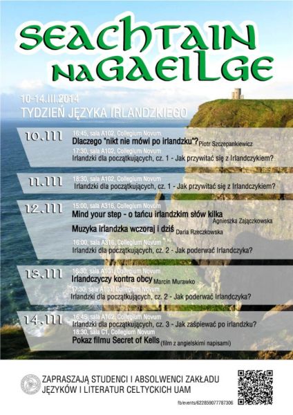 Studenci i absolwenci Zakładu Języków i Literatur Celtyckich na Wydziale Anglistyki UAM zapraszają na Tydzień Języka Irlandzkiego, któy odbedzie się 10-14.03.2014 w Collegium Novum.