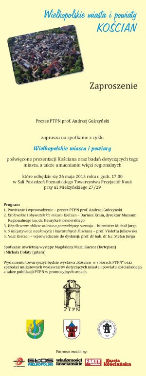 Poznańskie Towarzystwo Przyjaciół Nauk zaprasza społeczność UAM na kolejne spotkanie poświęcone dyskusji nad przeszłością, dniem dzisiejszym i przyszłością wielkopolskich miast i powiatów: Kościan. Gościem specjalnym będzie były rektor, prof. dr hab. Stefan Jurga.