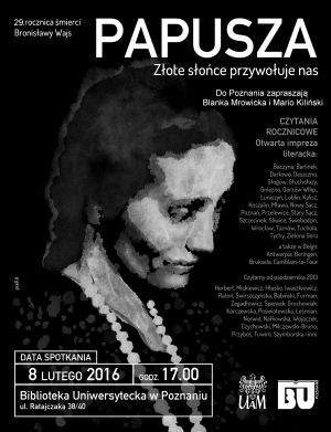 Biblioteka Uniwersytecka w Poznaniu serdecznie zaprasza 8 lutego 2016 r. o godzinie 17.00 na „Rocznicowe Czytania – Papusza, złote słońce przywołuje nas”. Z okazji 29 rocznicy śmierci Bronisławy Wajs, w Poznaniu jej utwory będą czytać: Mario Jakub Kiliński, Iwona Piotrowska, Blanka Mrowicka, Hanna Borówka-Woźniak, Krystyna Jazdon.