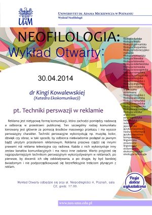 Serdecznie zapraszamy na wykład pt. Techniki perswazji w reklamie, który wygłosi dr Kinga Kowalewska z Katedry Ekokomunikacji. Wydarzenie odbywa się w ramach cyklu Wykładów Otwartych Wydziału Neofilologii.
