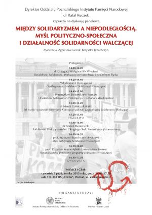 Dyskusja panelowa o programie i działalności Organizacji Solidarność Walcząca zorganizowana przez Instytut Pamięci Narodowej, Oddział w Poznaniu i Instytut Filozofii UAM z okazji 30-lecia powstania Oddziału SW w Poznaniu. Dyskusja odbędzie się 3 X 2013 r. w sali 117-118 DS „Jowita" przy ul. Zwierzynieckiej 7 w Poznaniu.