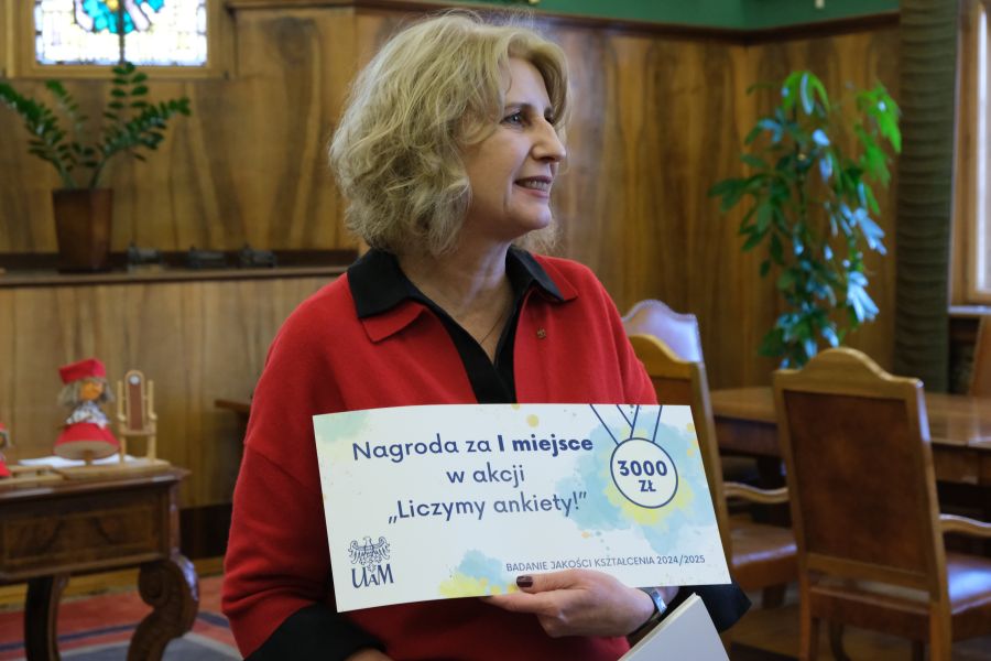 - Jak co roku spotykamy się w gronie przedstawicieli wydziałów oraz studentów, którzy uzyskali najlepsze wyniki w ogólnouniwersyteckiej akcji ankietowej - mówiła podczas uroczystości wręczenia nagród w ramach akcji "Liczymy ankiety!", prorektorka ds. studenckich UAM, prof. Joanna Wójcik. I dodała: - Chodzi o wydziały, na których największy odsetek studentów wypełnił ankiety oceniające satysfakcję ze studiowania na swoim kierunku. W tym roku nagrody w wysokości 3 000 zł trafią do studentów: Wydziału Matematyki i Informatyki, Wydziału Geografii Społeczno-Ekonomicznej i Gospodarki Przestrzennej, Wydziału Fizyki i Astronomii, Wydziału Psychologii i Kognitywistyki, Wydziału Neofilologii oraz Noteckiego Instytutu w Pile. Wszystkim laureatom serdecznie gratuluję!
