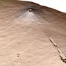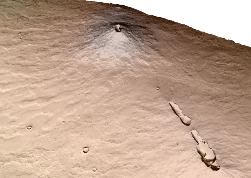 Trójwymiarowy model badanego systemu wulkanicznego. Na pierwszym planie widoczna jest szczelina wulkaniczna, natomiast w tle zlokalizowany jest stożek wulkaniczny. Model przygotowano poprzez nałożenie obrazu CTX (Context Camera) na numeryczny model terenu opracowany z wykorzystaniem fotogrametrii. Zastosowano sztuczną skalę barw do podkreślenia różnic wysokościowych.
